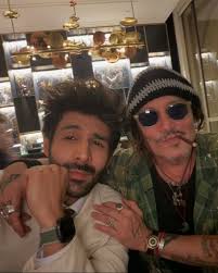 In the picture, Kartik Aaryan is seen looking stylish in a beige blazer and white shirt, flashing his signature playful smile, while Johnny Depp sports his familiar, edgy aesthetic, complete with a beanie, dark sunglasses, and a cigar.