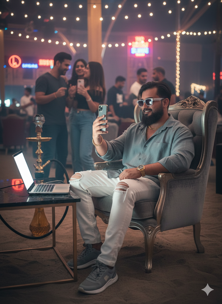 With the identical face and haircut, l, the uploaded image features a hyper-realistic 4K cinematic of a 35-year-old male wearing a branded grey loose shirt and white ripped loose fit pants. sunglasses with a deep white tint, grey sneakers, a bracelet, a chain, a timepiece, and a charming smile. His right hand is holding a mobile phone, his left hand is wearing a branded gold linen hukah, on a laptop, and he is lying in a chic and opulent chair and table at the Dubai Club. And there is a hukah on the table. In the background, there is a club with plenty of people around the man and woman. The sand is dark. Hair was medium long in size, like a model, men and women were taking selfies on a model who was sitting on a chair