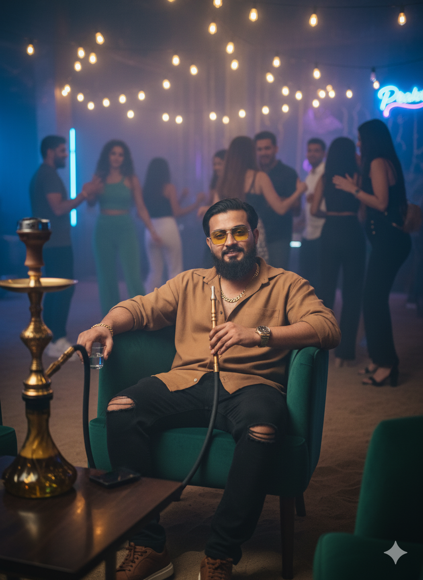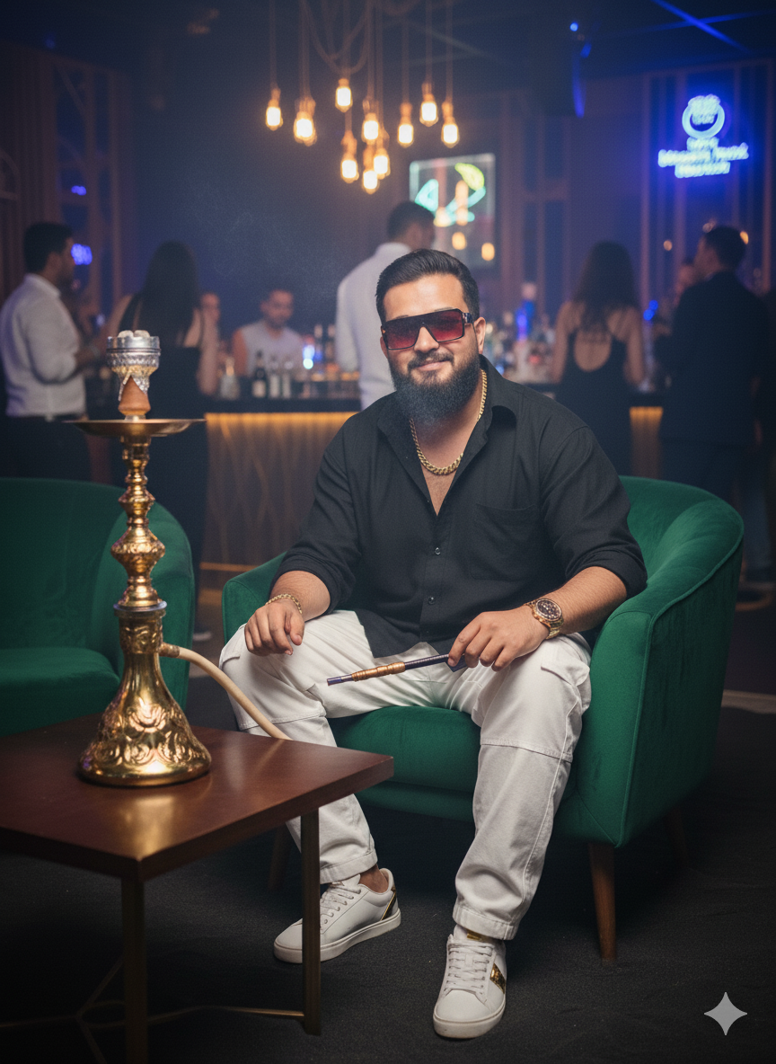 With the identical face and haircut, the uploaded image features a hyper-realistic 4K cinematic of a 35-year-old male wearing a branded black loose shirt and white cargo loose pants. sunglasses with a deep red tint, sneakers, a bracelet, a chain, a timepiece, and a charming smile. His right hand is holding a wine glass, his left hand is wearing a branded gold linen hukah, and he is lying in a chic and opulent chair and table at the Dubai Club. And there is a hukah on the table. In the background, there is a club with plenty of people around the man. The sand is dark.