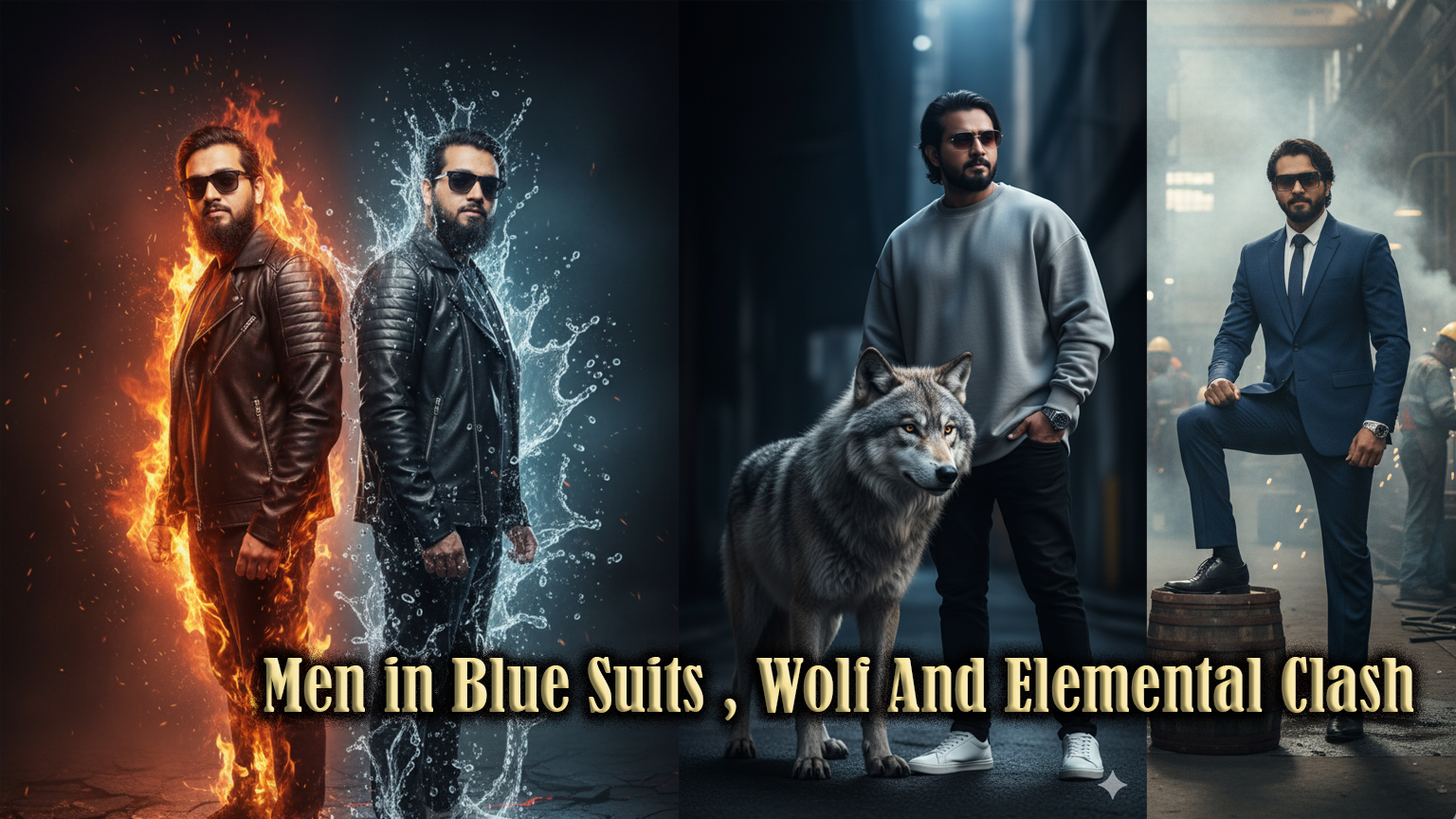 Men in Blue Suits, Industrial Scene open Google Gemini Add an Image on nano banana…