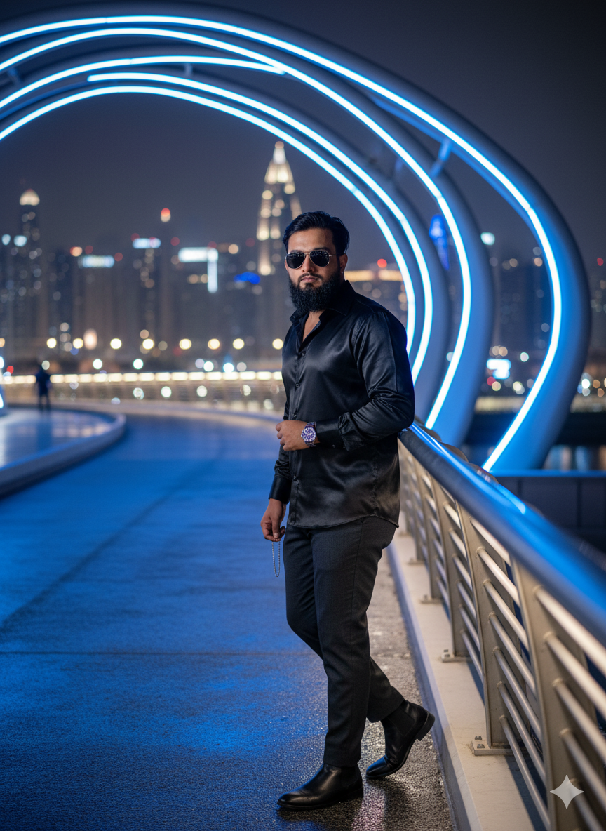 Ultra hyper-realistic 8K cinematic full-body portrait of the same man (exact face & hairstyle from reference) standing stylishly on Meydan Bridge, Dubai at night under glowing blue neon lights and wet road reflections. Wearing a black satin shirt, dark grey trousers, and black Chelsea boots with a silver chain, a luxury watch, and sunglasses reflecting city lights. Cinematic Dubai skyline bokeh, detailed lighting, fabric shine, and depth ultimately enhanced hyper-realistic night photoshoots. Use the same face upload image