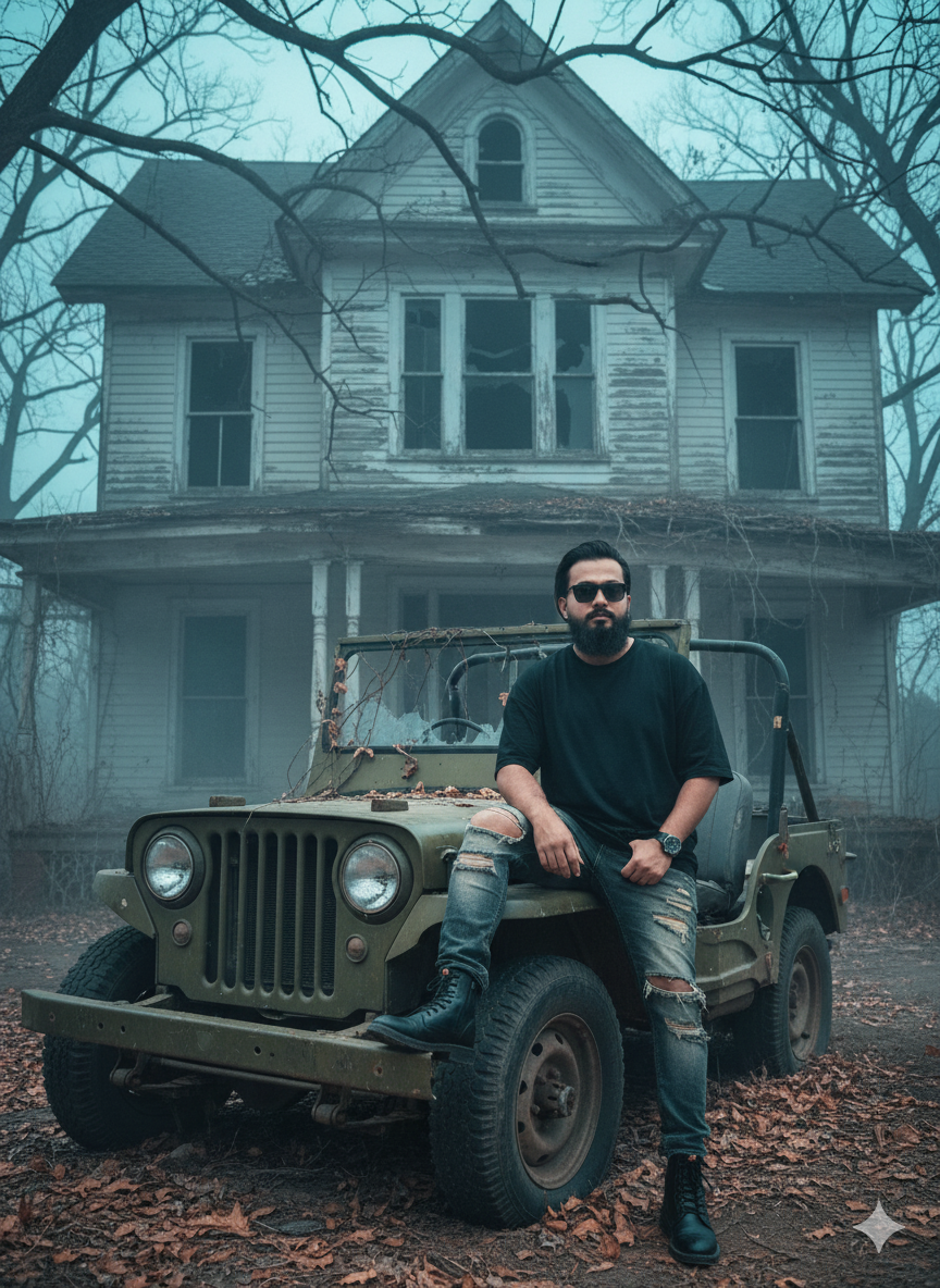 Based on the provided image, a hyper-realistic 4K cinematic portrait that preserves the young man’s face and haircut at 34. The film’s atmosphere is a young man sitting in a broken jeep in front of an old, broken house with leaves and a spooky atmosphere everywhere. The young man is dressed in a black loose T-shirt, torn jeans, black expensive shoes, a watch in his hand, and dark glasses. He has one foot on the ground and one inside the car, and there are dry leaves everywhere. Utilize the same face in the uploaded photo, and the model’s medium-sized hairstyle