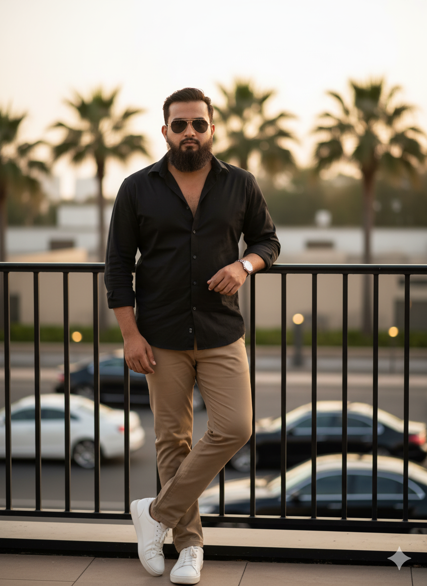 Ultra-detailed fashion editorial shot of the same man (same face reference) posing casually near a black metal railing in a high-end urban location. Wearing a crisp black cotton shirt tucked slightly in, tan slim trousers, luxury leather sneakers, and aviator sunglasses. Soft bokeh background with palm trees and luxury cars, professional lens blur, Vogue-style lighting, and tone. Use the same face upload image
