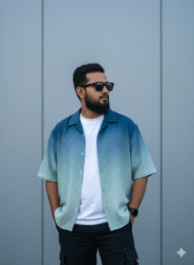 **Outfit**: He is wearing an **oversized, short-sleeved collared shirt** with a striking **blue-to-light-grey gradient** or **ombre effect**. Underneath, there is a plain white t-shirt. He is wearing dark **cargo pants** or shorts.