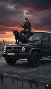 Prompt. Create a portrait of the person in the photo seen from a distance, wearing a baseball cap, sunglasses, es and a black bomber jacket, sitting on the roof of a matte black Mercedes-Benz G-Class, right hand holding a baseball bat, barbed wire next to a black panther with an intense gaze. Dramatic sunset atmosphere, with dark clouds in the sky.