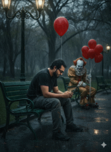 Create an image with my face, without altering my features, of a man with glasses, sitting on a rain-soaked park bench, wearing a black shirt, dark pants, and sneakers. He is looking at his phone. A red balloon floats above him. He is not holding the balloon; it floats above him. Behind him, Pennywise the clown is sitting in the background. The scene is set in a dark, rainy park with lampposts in the background, using the same face.