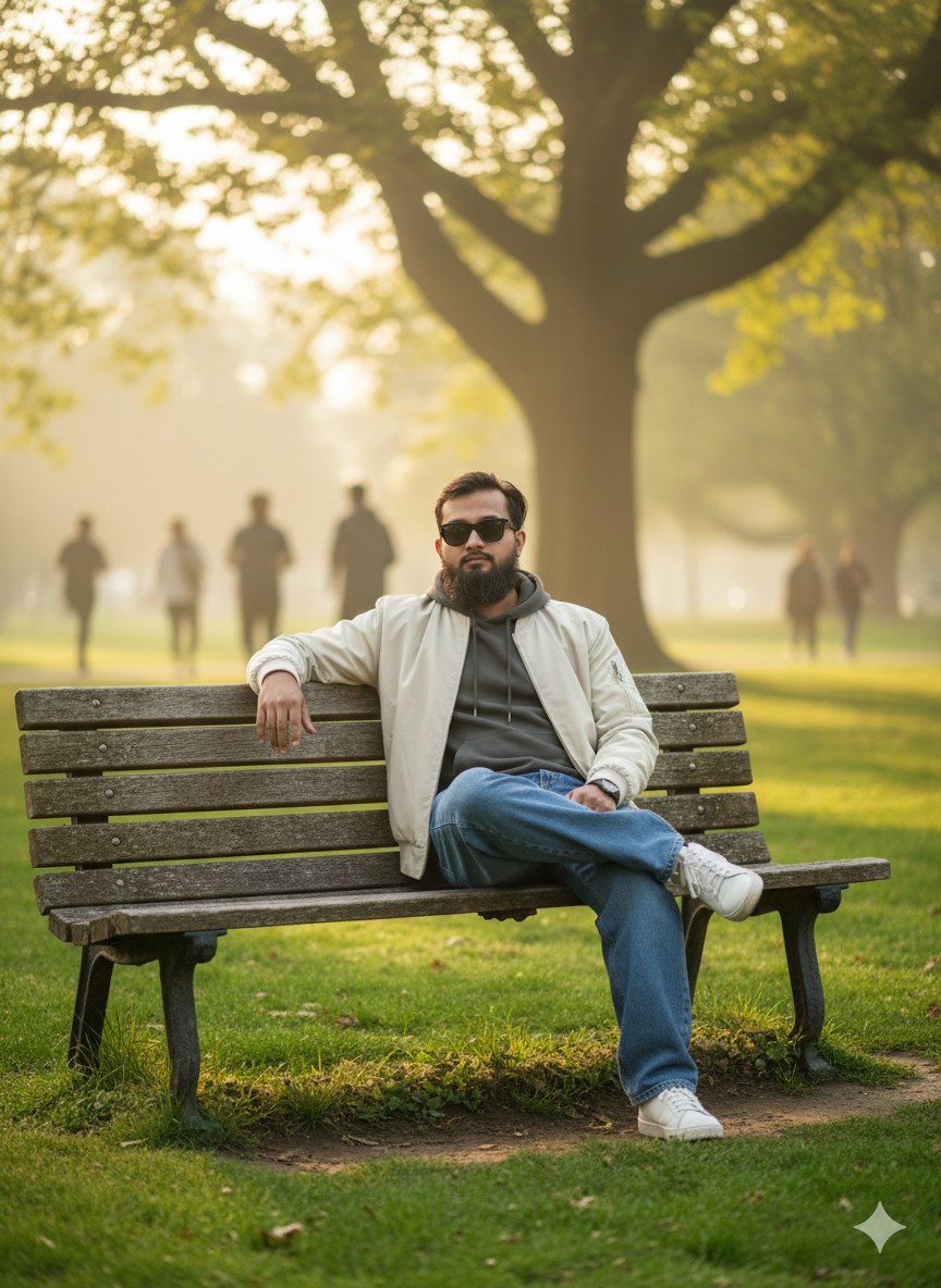 16k Ultra-realistic image of the young man in the uploaded photo (same face & hairstyle, 100% match – do not change or edit his face). He is sitting casually on a wooden park bench in the morning sunlight, surrounded by lush green grass and soft golden rays filtering through the trees.