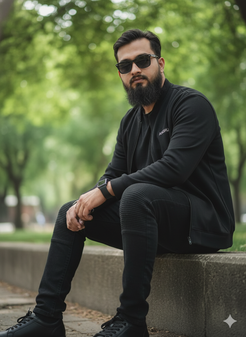 Ultra-realistic outdoor half-body portrait of the same face, sitting casually on a concrete ledge. He wears an AMSHU jacket with black inner, black biker jeans, and a black smart watch. Rectangle sunglass, shoes visible. Surrounded by greenery with soft daylight filtering through leaves. Muted cinematic tones, low-angle shot with sharp focus on face, blurred background. Relaxed, stylish editorial street vibe. He looks at me.” Use the same face upload image, and the  beard will be medium