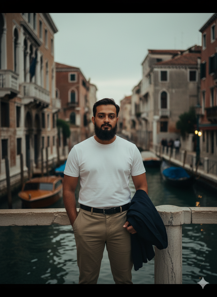 **Full-body, cinematic fashion portrait** of a model standing in an iconic Italian canal setting. The man is wearing classic, minimalist attire: a white t-shirt, high-waist khaki trousers. Rich, moody colors, **anamorphic aspect ratio**, **film grain**, **shot on a 50mm lens**. Use the same face upload image