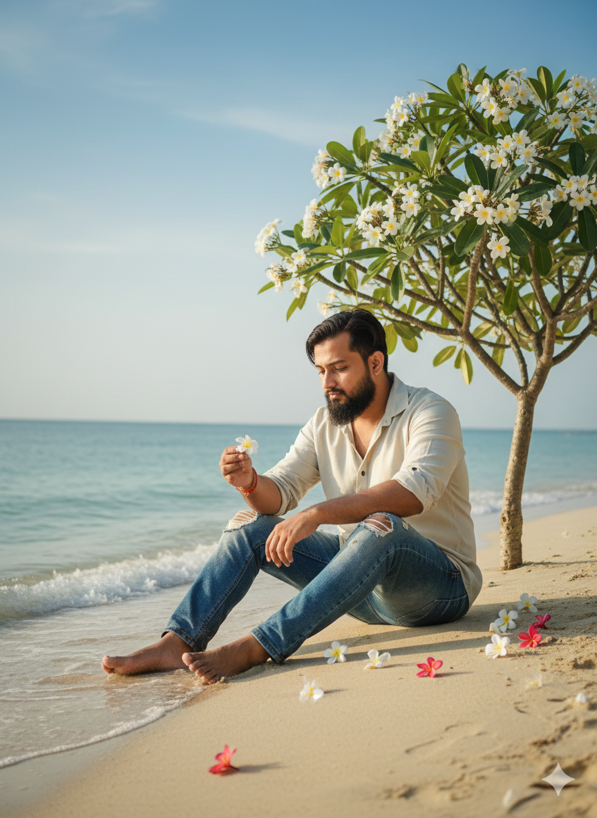 Produce a high-resolution, ultra-realistic, cinematic portrait of a fashionable young man in 8k resolution. The image features him by the ocean, with gentle waves accompanying him. The sand is crunching beneath him, adorned with small white beach blooms, under a clear blue sky .Outfit: A linen shirt paired with denim pants.Atmosphere: Light, gentle, and serene. There are white plumeria blossoms with red accents. A sizable tree with these white flowers (also known as frangipani) will be planted in the sand. He will be seen selecting a flower, with numerous others scattered around him on the ground. He will be seated; please keep the facial expression unchanged and upload the image.