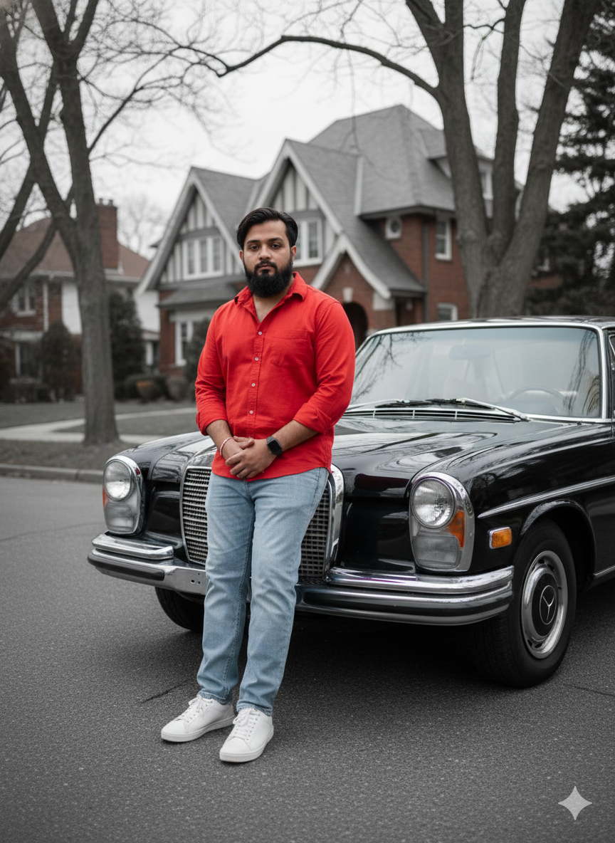 Ultra realistic close-up portrait of a fashionable young man [maintain actual facial features from the provided image] He is dressed in a red top, light blue denim trousers, and white footwear, leaning against the front of a vintage black Mercedes-Benz from 1972, situated on a serene street, looking towards the camera. The vehicle is located in front of a spacious bungalow with sharply slanted roofs and brick accents. The scene is devoid of leaves. The overall color palette is grey, with the clothing colors easily noticeable. Do not modify the facial image.