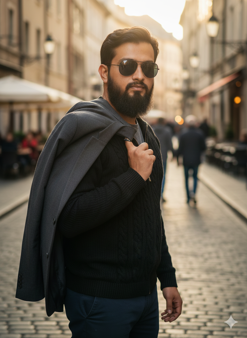 An 8K hyper-realistic cinematic mid-body portrayal features the same young male standing in a laid-back modeling stance, turned slightly to the side with his head glancing back over his shoulder at the camera. One hand holds his jacket draped easily over his shoulder, while the other hangs relaxed at his side. His demeanor behind the dark sunglasses exudes tranquility, assurance, and a natural sense of style – projecting a cinematic “heroic demeanor. ” He is dressed in a dark black zip-up cable-knit sweater. Do not modify the facial image uploaded.