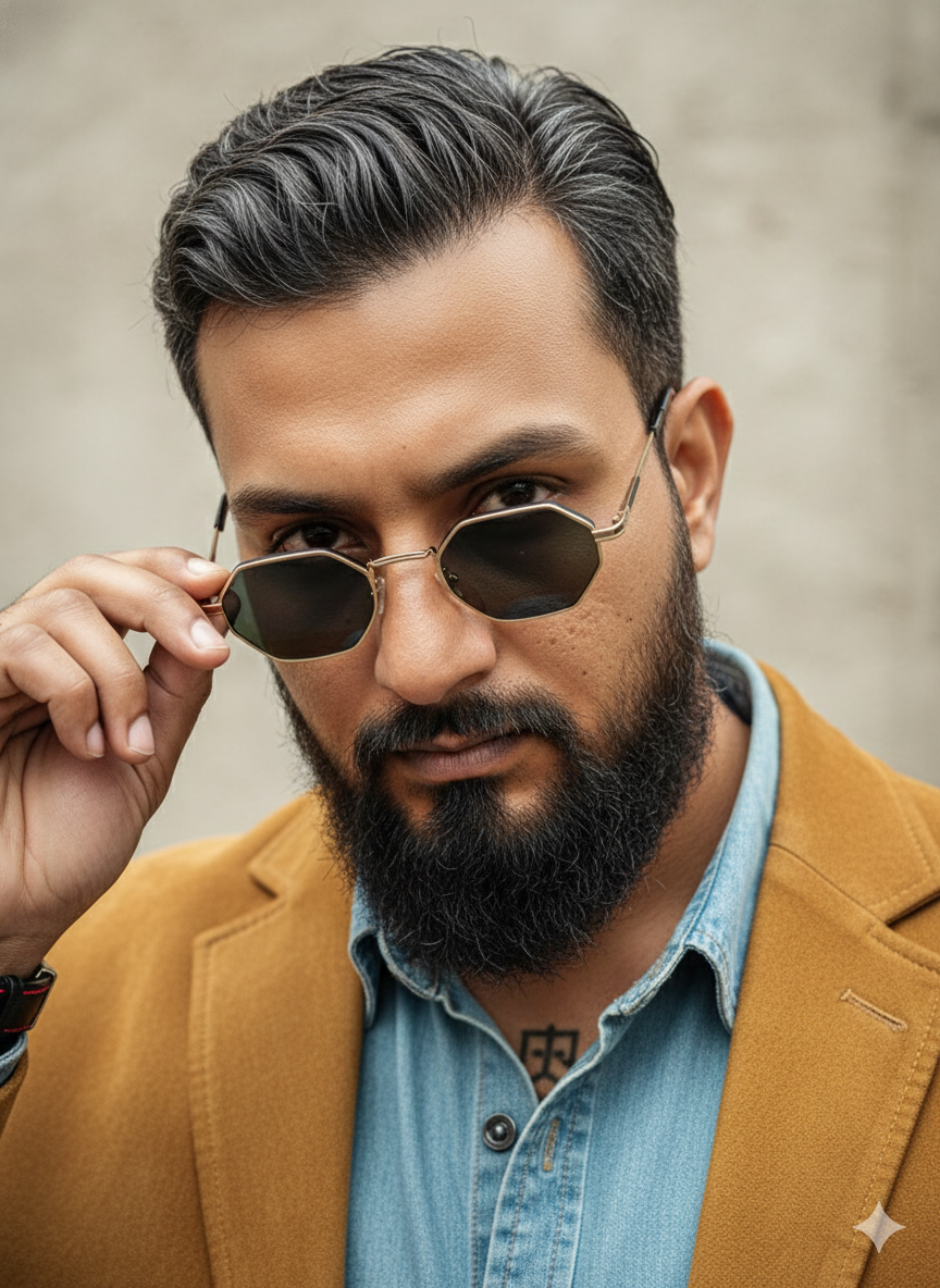 Character & Focus: The shot is a tight close-up from the chest up, focusing on the face. The man has a distinct salt-and-pepper hairstyle, with the grey visibly mixed into the dark hair. He sports a neatly trimmed beard and mustache with strong jawline definition. He has a serious, slightly challenging Attire & Accessories: He is wearing a tan or mustard-yellow suede jacket over a light blue denim shirt. His hand is raised to his face, adjusting a pair of unique, small, octagonal-framed sunglasses with a gold/black trim. On his wrist, there is a large, classic analog wristwatch with a black leather strap and prominent red stitching. A small, stylized neck tattoo (a simple symbol or letter) is visible on his collarbone.