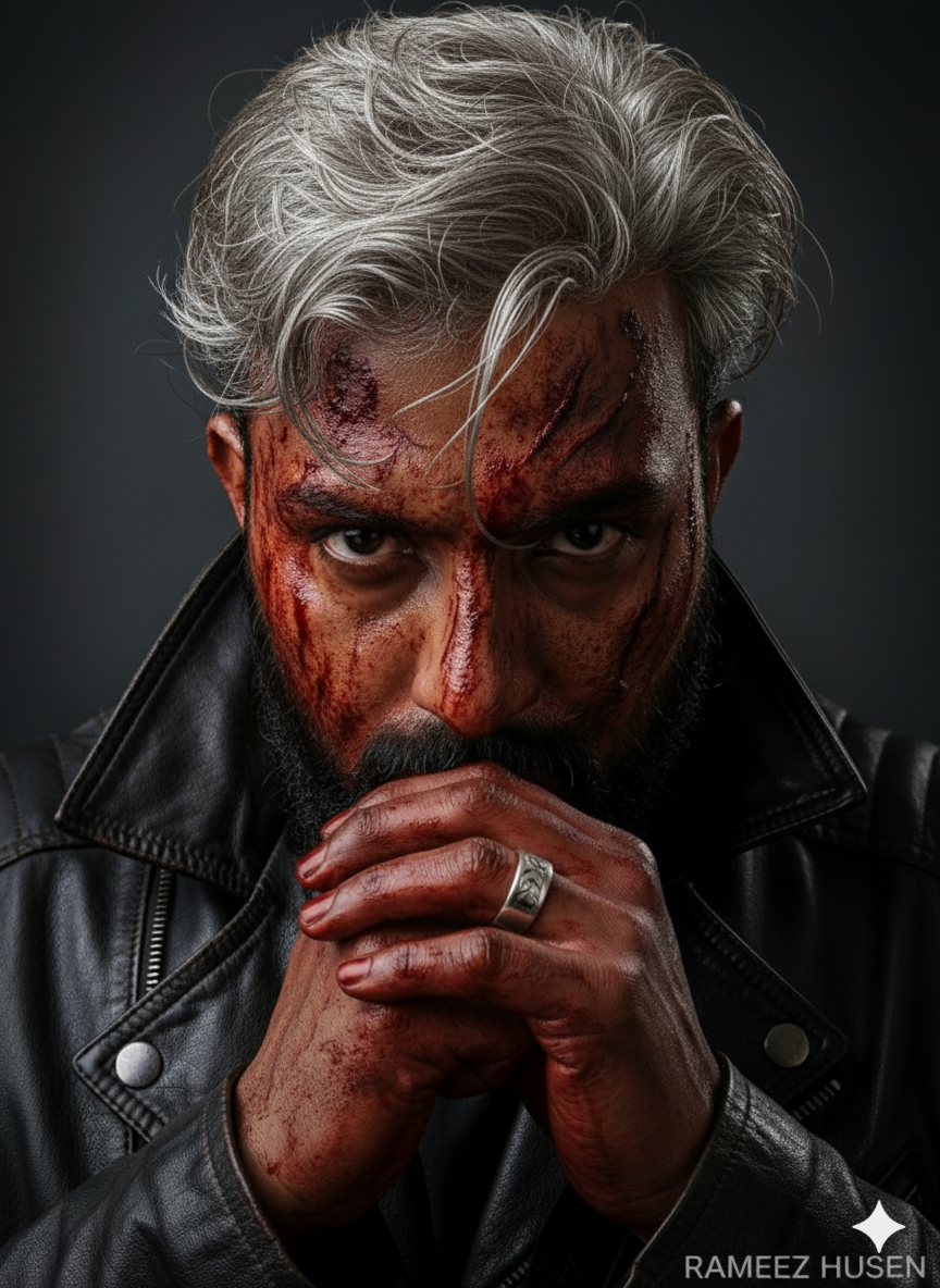Composition: Close-up or medium close-up shot, focusing primarily on the face and clasped hands.”A dramatic close-up, cinematic portrait of a brooding, middle-aged man with silver-streaked, disheveled hair, dark stubble, and intense, shadowed eyes. His face and hands are smeared with visible blood and fresh cuts, conveying a brutal fight or a ruthless past. He is wearing dark, weathered clothing (a leather jacket or trench coat is implied). The man holds his bloodied hands clasped together near his mouth, staring directly into the camera with a fiercely intense and focused expression. The lighting is low-key, harsh, and directional, with deep shadows emphasizing the scars and textures, using an overall dark, gritty, and high-contrast color palette of deep reds, browns, and muted blacks. Cinematic, Ultra-realistic, Photorealistic, 8K, Shot on Arri Alexa, cinematic lighting.” Use the same face upload