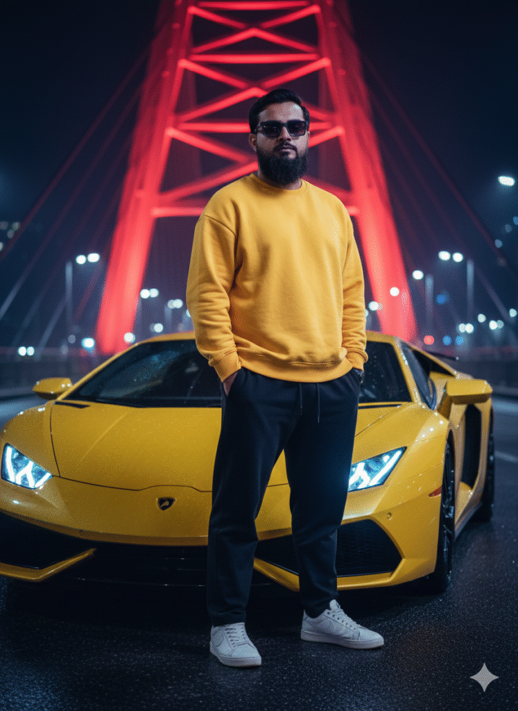 Utilise my image, a wide-angle image of a fashionable individual dressed in a black hoodie and dark denim, lounging effortlessly in the back compartment of a sleek black sports vehicle. He has on dark shades and timeless black and white footwear. The environment is a city street during dusk, with blurred lights from skyscrapers and vehicles providing a lively background. Completely utilise my provided reference picture to create an image.