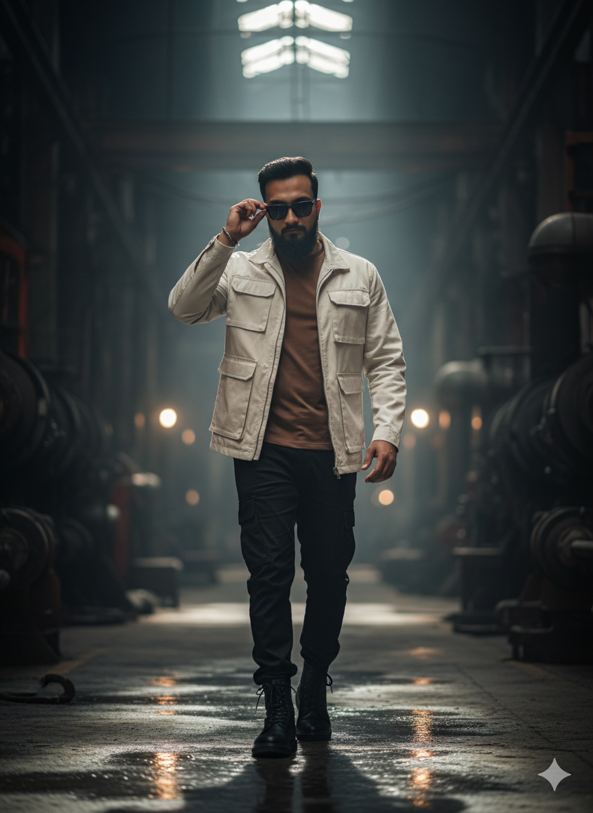 8K hyper-realistic cinematic portrait of a fashionable young man in a dark industrial setting, confidently approaching the camera with the same face and hairstyle as reference. Wearing a dark white utility jacket, black cargo pants, a fitting brown t-shirt, and black sunglasses, he holds a steel rod with one hand. utilization of the same face, moodily directed lighting, reflections, and cinematic shadows. Submit a picture, and the model’s hair must be medium-length.