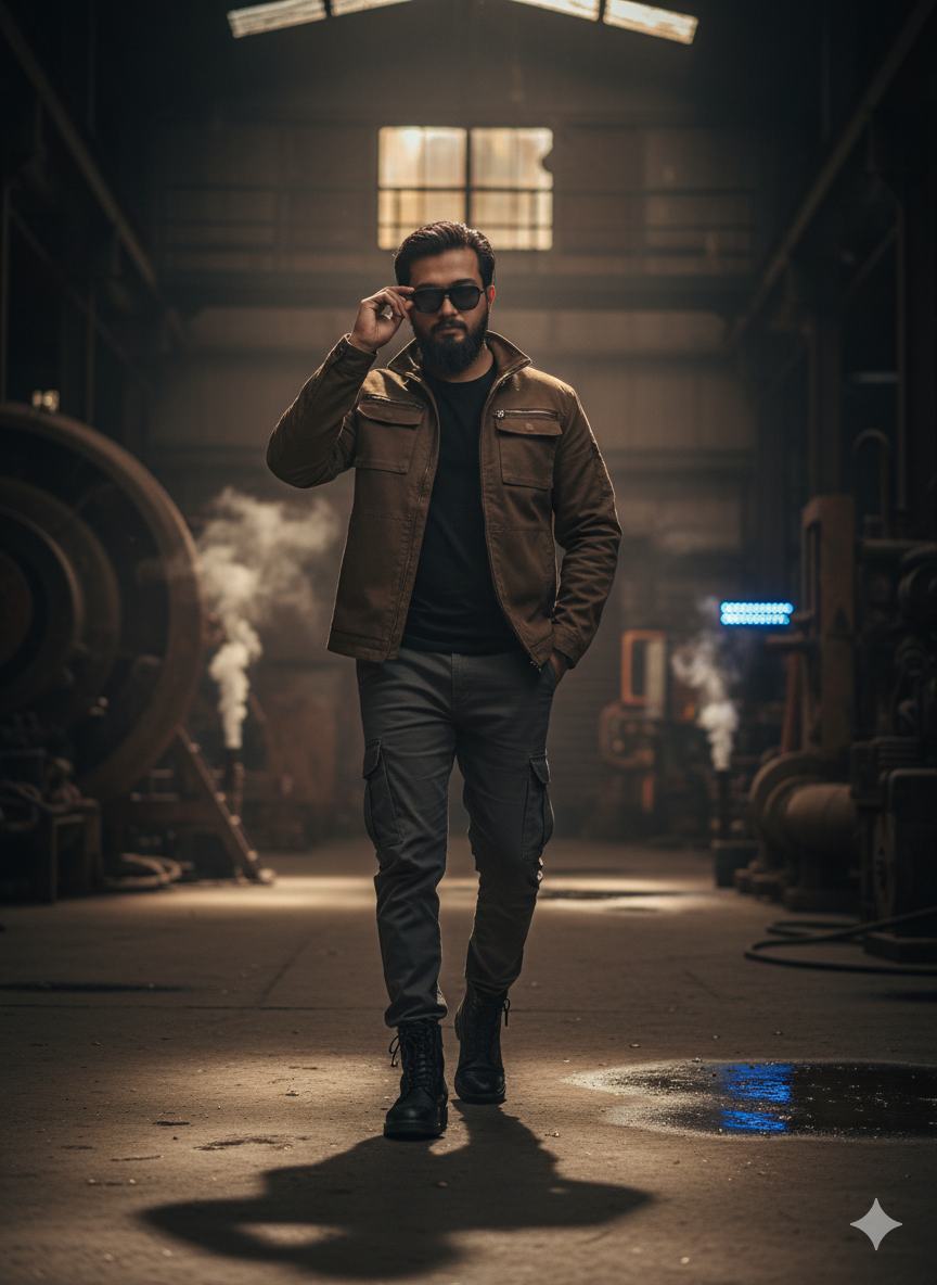 8K hyper-realistic cinematic portrait of a stylish young man (same face & hairstyle as reference) walking confidently toward the camera in a dark industrial setting. Wearing black sunglasses, a fitted black t-shirt, a dark brown utility jacket, and cargo pants, one hand adjusts his shades. Moody directional lighting, cinematic shadows, reflections, and rich depth of field. Use sthe ame face upload image, and hair must be medium long like the model