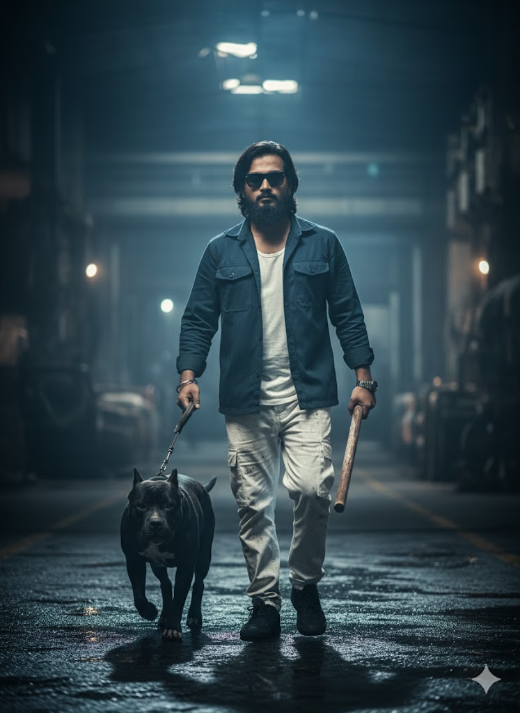 8K hyper-realistic cinematic portrait of a fashionable young man in a dark industrial setting, confidently approaching the camera with the same face and hairstyle as reference. Wearing a dark blue utility jacket, white cargo pants with dust, a fitting white dusty t-shirt, and black sunglasses, he holds a black dog with one hand. and the dog was a pitbull, and the other hand was a wooden stick, utilizing the same face, moodily directed lighting, reflections, and cinematic shadows. Submit a picture, and the model’s hair must be medium-length.