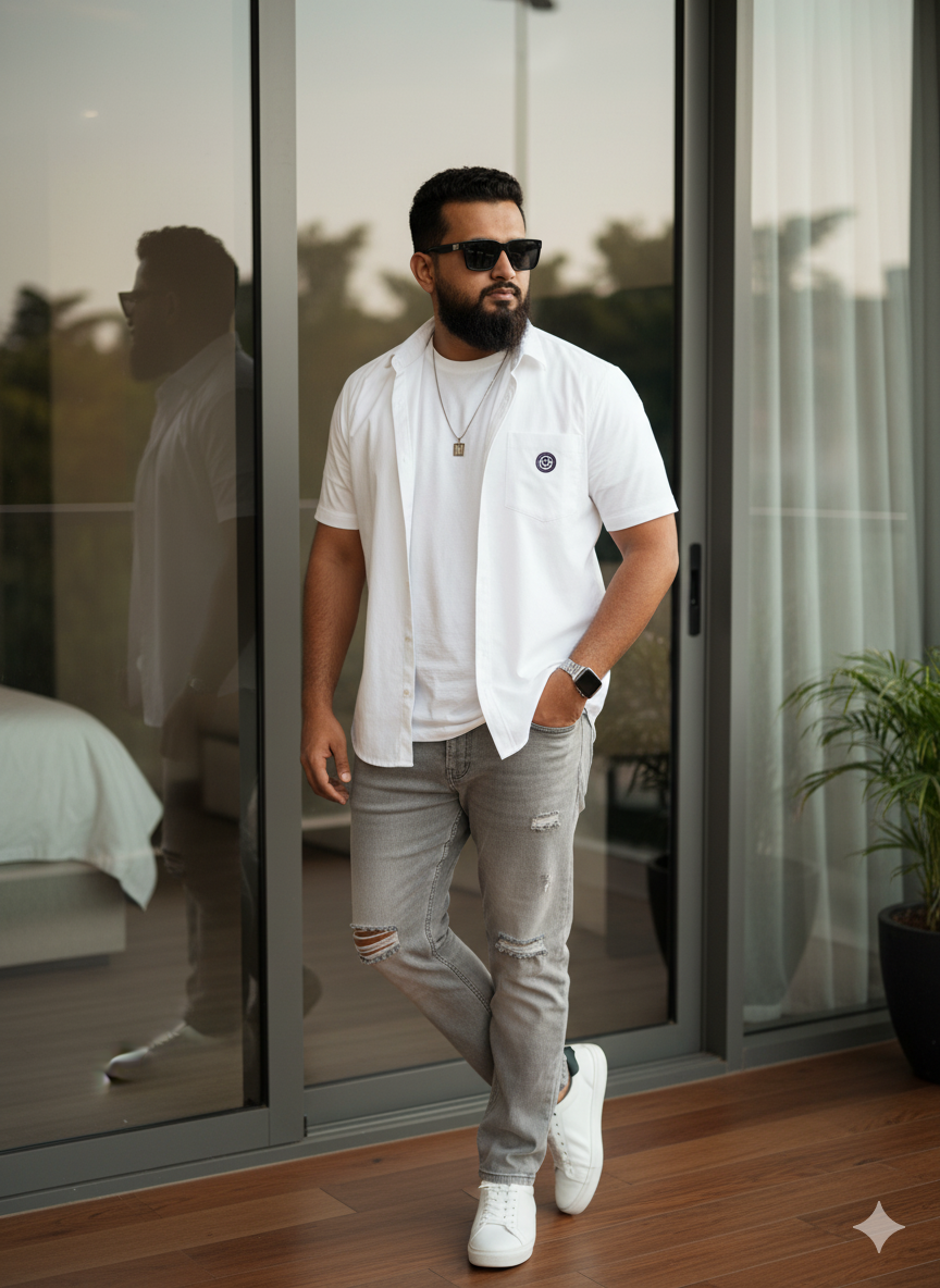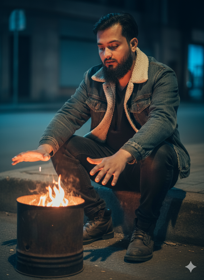 He sits on a street curb beside a small fire in a metal drum, hands stretched toward the heat. Denim jacket with shearling collar, black jeans, scuffed boots. Expression — exhaustion softened by warmth. Framing: mid-close, shallow focus on eyes; lighting: warm orange key from flame with soft blue fill from streetlight. Cinematic contrast balance between light and shadow. Make sure the face remains the same and 100% perfect.