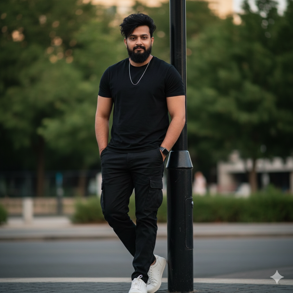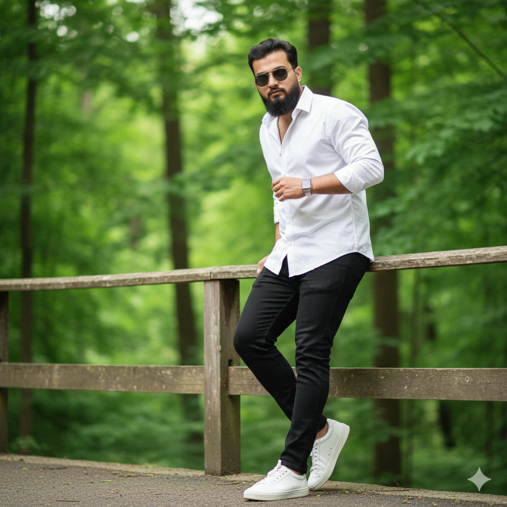 A fashionable young man casually positioned outside, resting against a weathered wooden fence, has the same characteristics in his face, hairstyle, and beard as shown in the reference, which indicates that “his haircut and beard style are the same, and his face looks exactly alike. “” In 8K resolution. Dressed in a neat white collared shirt, dark jeans, and white athletic shoes. Sporting sunglasses, he exudes a relaxed and self-assured aura. The scene is illuminated by gentle natural light, featuring a vibrant green backdrop filled with trees and plants, and captured with a cinematic shallow depth of field through high-quality DSLR photography. Use the same facial image uploaded.