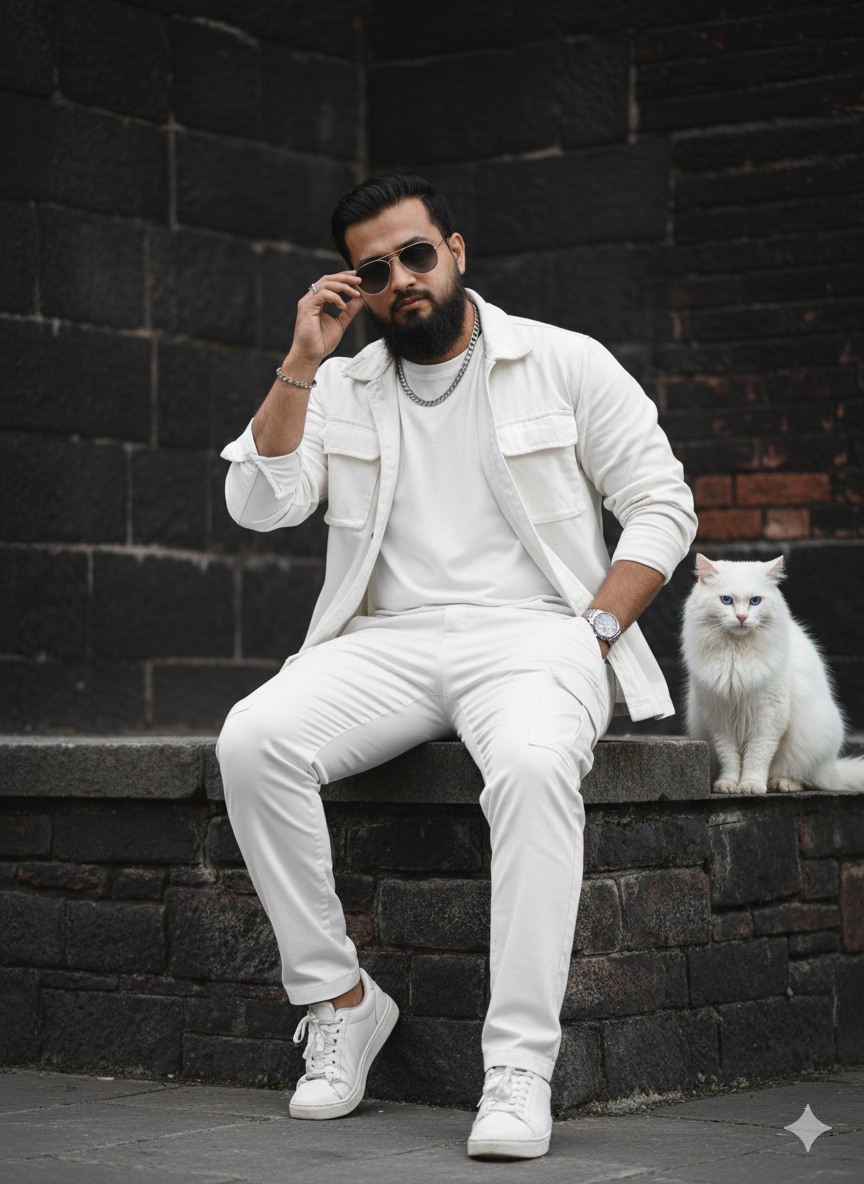 Make a picture of me posing like the one that is provided, with brick and stone pieces set against a dark, metropolitan backdrop. One hand was in a pocket, and the man was sitting on a wall. I should be confidently facing the camera while resting on a low stone wall or other structure. A man with a white T-shirt, a white cargo jacket, dark white cargo pants, a wristwatch, sunglasses, sneakers, a bracelet, and a chain. And on the wall prison cat was sitting in white color. Natural, somewhat diffused lighting creates a somber yet distinct atmosphere. The overall aesthetic should be chic and contemporary. The hair was touched by the left hand.