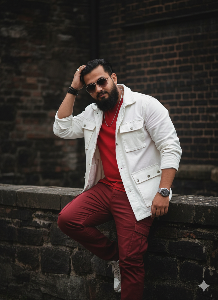 Make a picture of me posing like the one that is provided, with brick and stone pieces set against a dark, metropolitan backdrop. I should be confidently facing the camera while resting on a low stone wall or other structure.A man with a red T-shirt, a white cargo jacket, dark red cargo pants, a wristwatch, sunglasses, sneakers, a bracelet, and a chain.Natural, somewhat diffused lighting creates a somber yet distinct atmosphere. The overall aesthetic should be chic and contemporary. The hair was touched by the left hand.