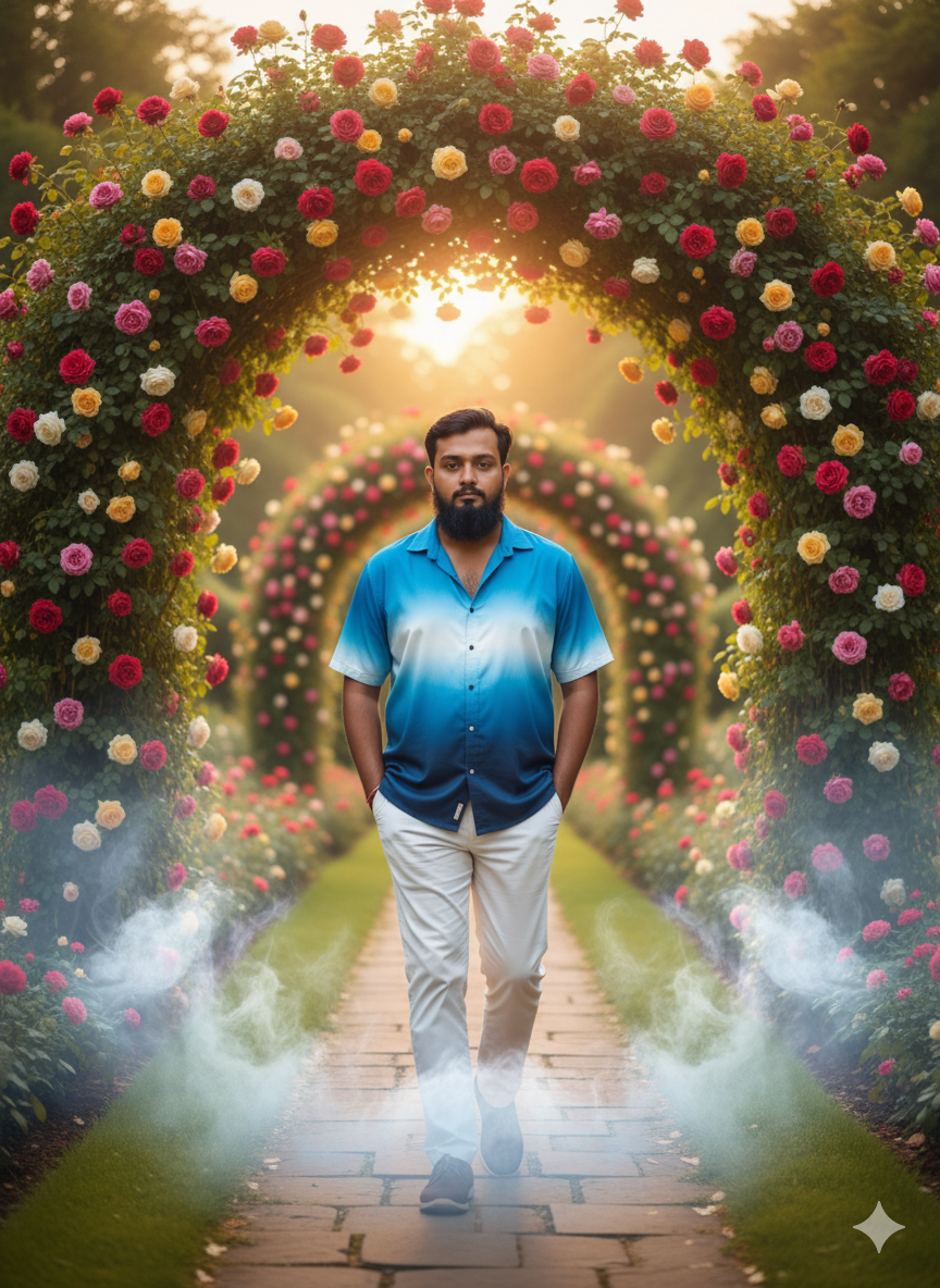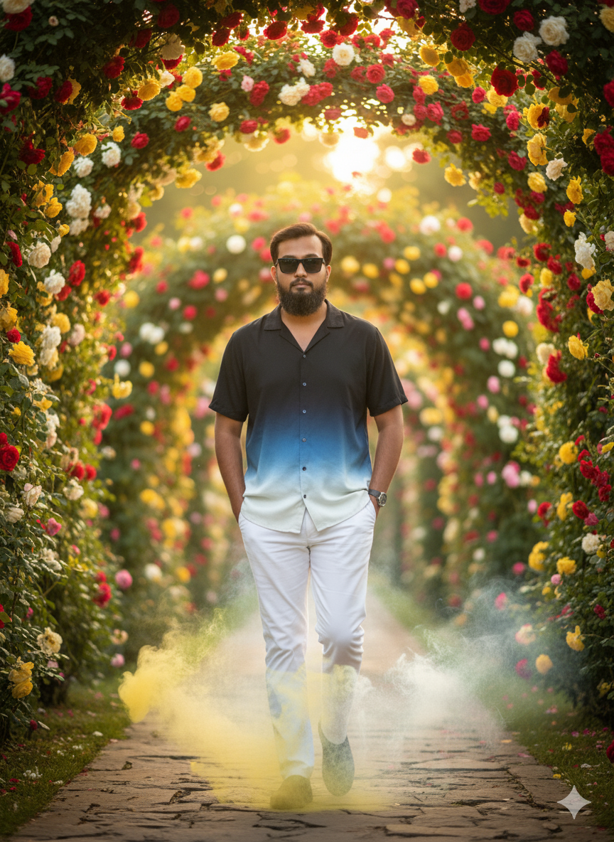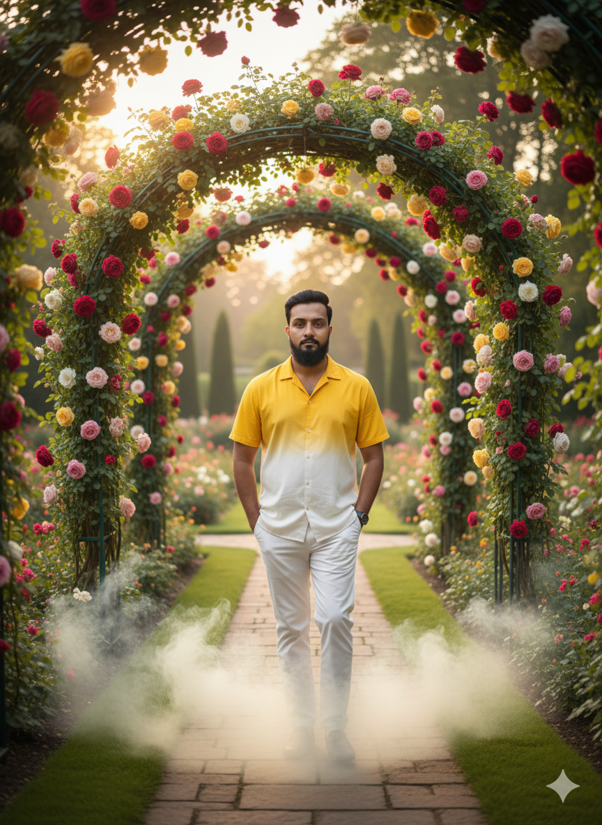 An image shows a young Indian man striding boldly down a stone path in a garden while wearing white pants and a yellow and white ombré blouse. He is surrounded by white and yellow smoke, with his hands in his pockets, and framed by an arch of vibrant trees and roses. The reference “he has a haircut, is the same style, and beard cut is the same style and face is the same” describes the man’s face, hairstyle, and beard style. resolution of 16K.