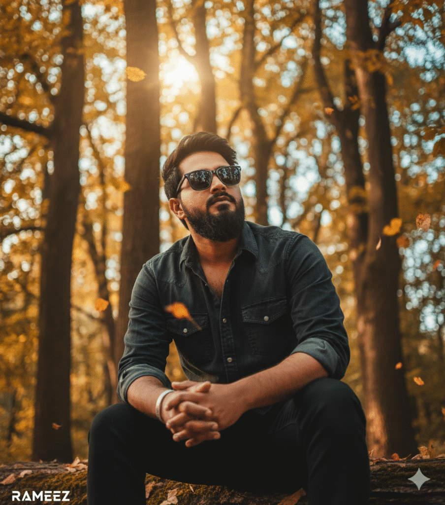 A young individual outside beneath tall trees, maintaining the same facial appearance as the reference image, no alterations to the face, lifelike skin texture, genuine expression and characteristics, seated on either a rock or a wooden log, mildly leaning forward with elbows resting on his knees, hands loosely clasped, gazing slightly upwards towards the sunlight, pensive and serene atmosphere, wearing a dark denim shirt featuring natural creases, sleeves rolled up halfway, sunlight filtering through the foliage, casting striking light patterns on his fa ce,golden leaves descending around him, gentle autumn breeze, The background is softened with a rich bokeh effect, warm sunlight contrasted with a cool sky, 8K hyper-realistic cinematic portrait showcasing ultra-fine skin deta ils,ideal contrast between shadows and highlights, HDR tones, natural film grai n,depth of field present, low-angle lens perspective, 35mm cinematic lens at f/1.4,gentle motion blur on the leaves, vibrant colors, evoking an emotional narrative feel,Incorporate stylish text in the bottom-left corner: RAMEEZ