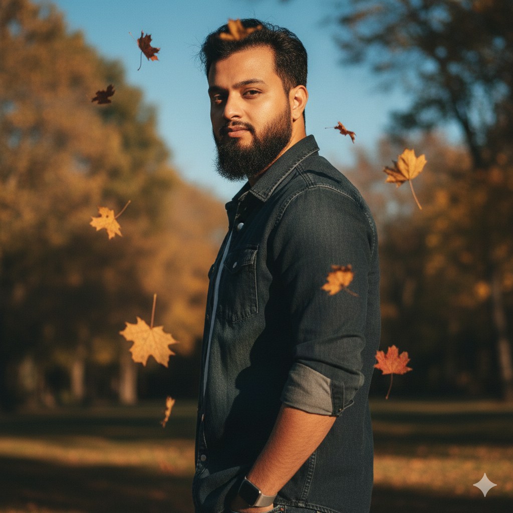 A young male figure is positioned in a serene outdoor environment, exhibiting the same facial expression and features as in the reference image; his face remains unchanged, showcasing lifelike and unedited details, with smooth, natural skin. He stands at an angle, slightly oriented towards the camera, with one hand tucked into his pocket and the other resting naturally at his side, a gentle breeze lightly tousles his hair, displaying a confident, relaxed stance. He is dressed in a dark denim shirt with sleeves rolled up, with buttons visible, golden sunlight shines from one side, casting striking shadows, autumn leaves float in the air, complemented by warm light and a deep blue sky behind him, captured in 8K with hyper-realistic visuals and cinematic lighting, emphasizing sharp facial features, offering a high dynamic range, along with ultra-detailed skin pores and individual hair strands, subtle film grain adds texture, with a blurred background creating depth of field, photographed using a 50mm cinematic lens at f/1.8 for a portrait effect, featuring a low contrast backdrop, with stunning warm color grading, maintaining a natural appearance.