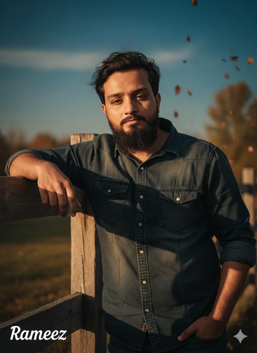 A young man situated in a scenic outdoor environment, displaying the same facial expression and features as the reference image, without any alterations to his face. His complexion appears naturally smooth and unrefined. He leans comfortably against a wooden fence with his body slightly angled toward the camera. One hand is placed on the top of the fence while the other rests in his pocket. His posture reflects a relaxed, confident demeanor, and a gentle breeze tousles his hair. He sports a dark denim shirt with the sleeves rolled up, with buttons clearly visible. The golden sunlight illuminates from the side, casting striking shadows. Autumn leaves are drifting in the air, and the background shows a warm light against a deep blue sky. The image is in 8K hyper-realism, featuring cinematic lighting and sharply defined facial features. It has a high dynamic range with intricately detailed skin pores and strands of hair, alongside a subtle film grain. The depth of field creates a blurred background, captured through a 50mm cinematic lens at f/1.8 for a portrait, with a background of low contrast. The overall color grading is warm and epic, giving a natural appearance.Include stylish text in the bottom-left corner: Rameez